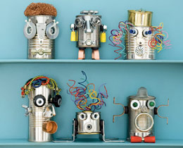 3. For facial features, arms, propulsion devices, and communication arrays, look for items around the house and at the hardware store. We used bolts, brackets, hinges, keys, wing nuts, switches, bottle caps, washers, knobs, and more.